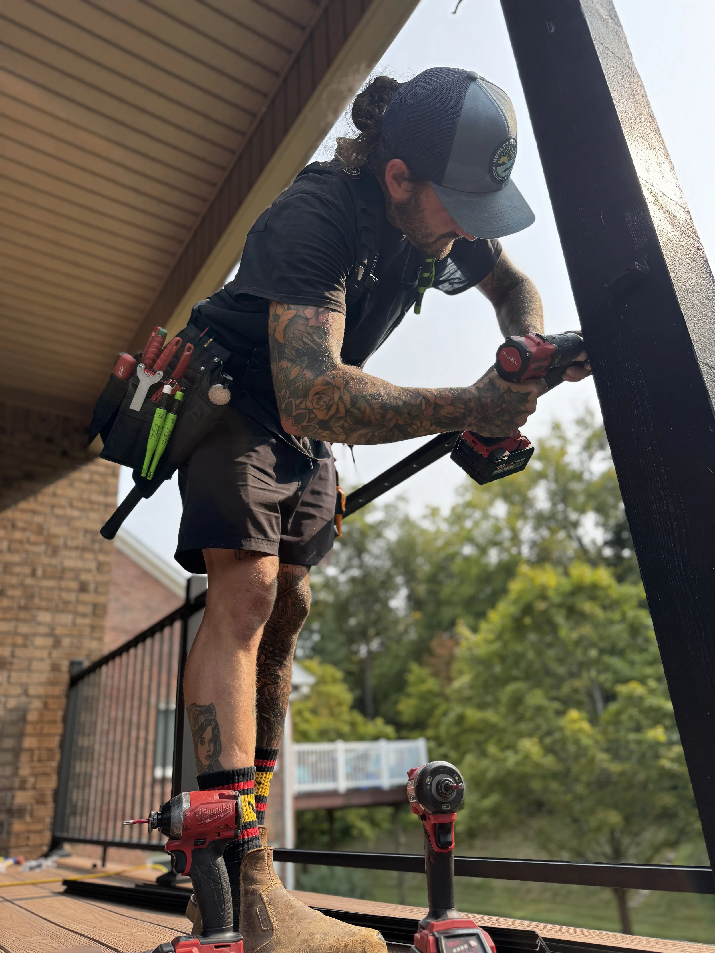 When Zach isn’t out building, you’ll usually find him spending time with his fiancée Christine and their son, Oliver. He loves being outdoors whether that’s hiking, skating, or just enjoying a laid-back day with family and friends. Originally from Michigan, Zach put down roots in Ohio, where he balances his passion for carpentry with other creative outlets like painting large-scale murals. He also loves to travel and ride BMX, which feed into his adventurous, free-spirited outlook on life. That same creativity, energy, and easygoing nature carries over into his work making every project not just a deck, but a personal extension of the families he builds for.